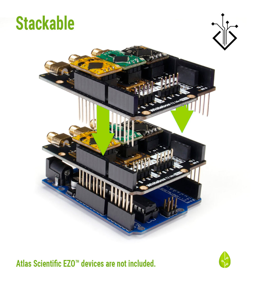 Whitebox T2 (Arduino), bir Arduino mikrodenetleyici ile birden fazla Atlas Scientific EZO™ cihazını okumanın hızlı ve kolay yoludur. Whitebox T2 MkII, 2 izole, 1 izole olmayan EZO™ yuvasına ve 5pin EZO™ Veri cihazları için 2 konektöre sahiptir.